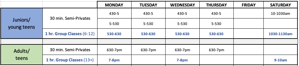 1-hour Group Classes and 30-minute semi-private lessons for every student